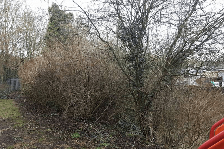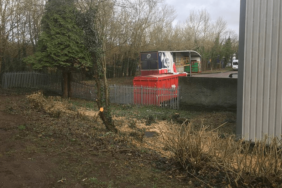 This area behind one of the units on a site we maintain was a breeding ground for tenants to dispose of their rubbish. We suggested to our client that if we removed/reduced the shrubs and trees it would open up the area, therefore reducing the temptation for waste to be discarded.