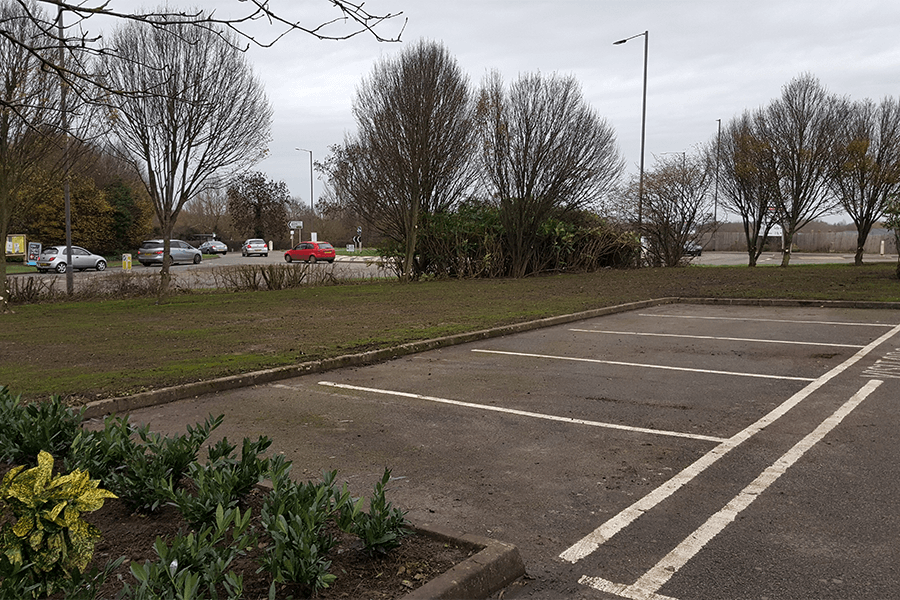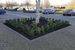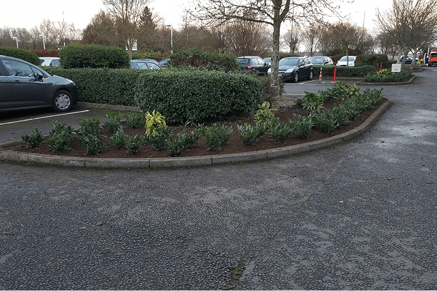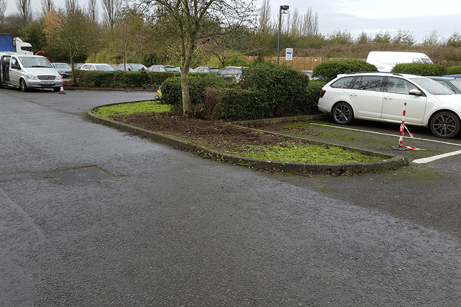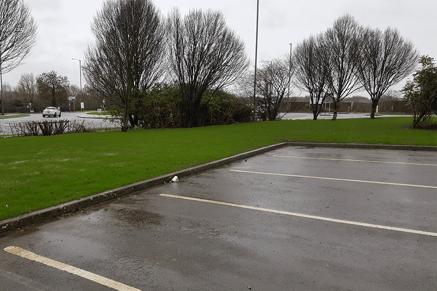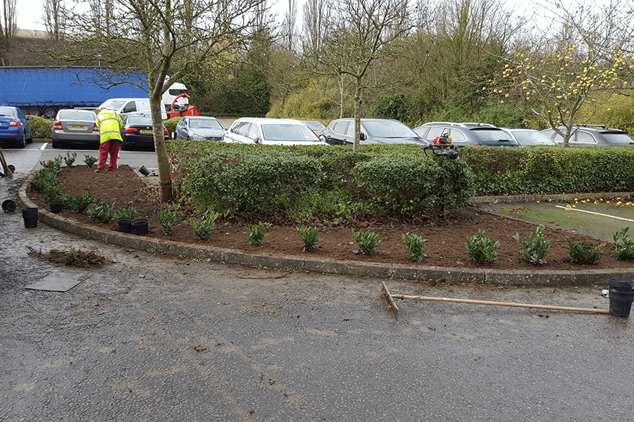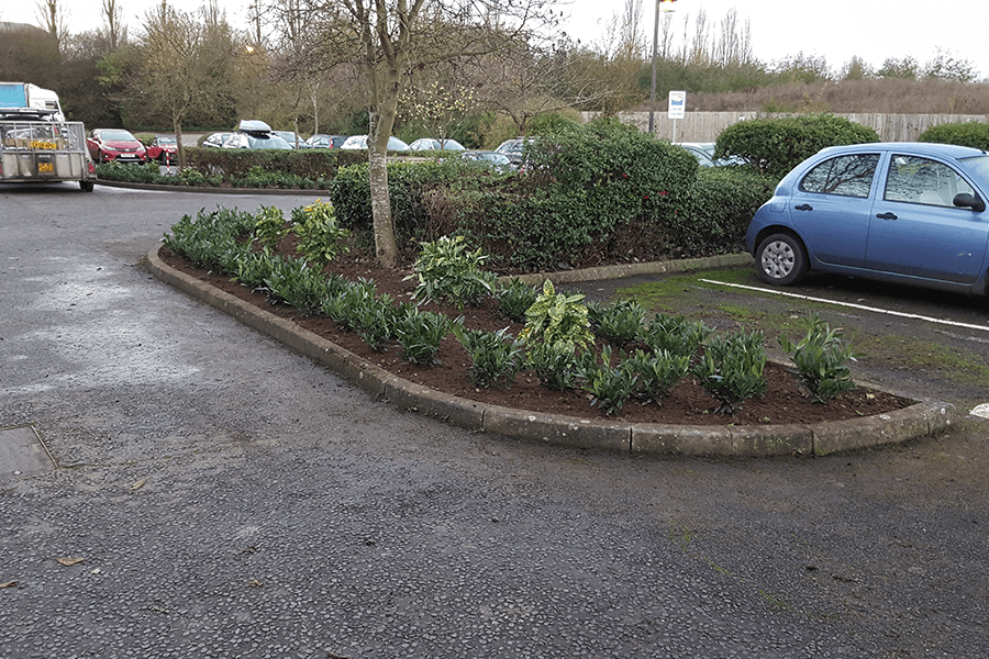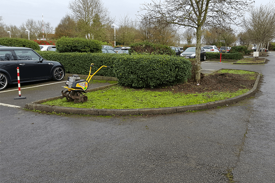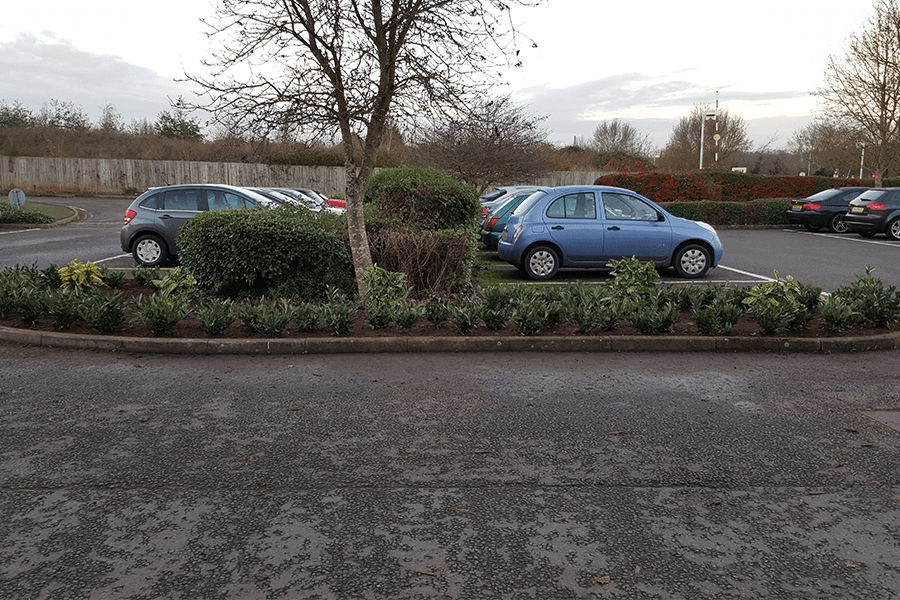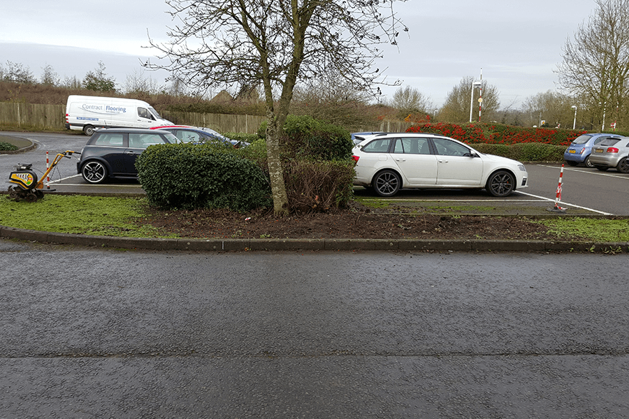 We started off by completely clearing the area including the removal of the tree stumps using a stump grinder then levelling the area so we could import fresh soil in at a later date ready for grass seeding. This allowed us to keep the remaining trees as we prefer to keep trees in the ground were possible. All of this was just on the front area of the site. We also created new planted areas around the car parks and site entrance to bring more colour and foliage to what was just dull car parking bays.